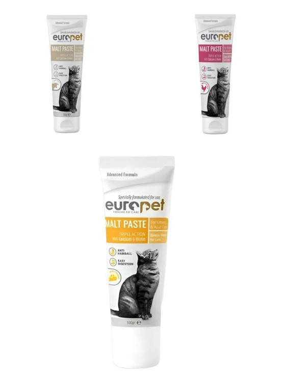 مالت و خمیر گربه یوروپت (Europet) یک مکمل ضروری برای سلامت گربههاست؛ مخصوصاً گربههایی که زیاد لیس میزنن و دچار گلولههای مویی (Hairball) میشن.